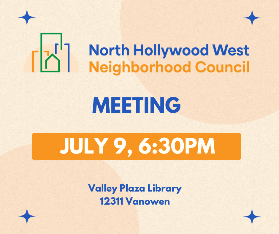 Join us for the next meeting of the NoHo West Neighborhood Council Wednesday, July 9, 6:30pm at Valley Plaza Library, 12311 Vanowen St. Please arrive before 6:30 to enjoy networking and light refreshments.
