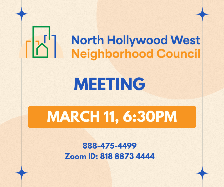 Join us for the next NoHo West Neighborhood Council Meeting Wednesday, March 11, 6:30pm online.